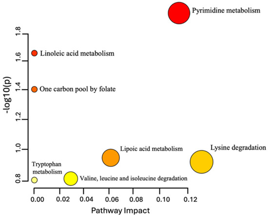 Raw metabolite abundance data were processed and analyzed using MetaboAnalyst 6.0 (McGill University, Montreal, Canada; http://www.metaboanalyst.ca) (accessed 13 December 2023). Prior to statistical modeling, data were median-normalized, log-transformed, and Pareto-scaled to approximate a normal distribution and minimize the influence of high-abundance features.