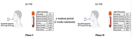 Study of Sacubitril/Valsartan (97.2 mg/102.8 mg) in healthy volunteers (n = 14), with eight sampling points per phase and a ≥ 2-week washout period.