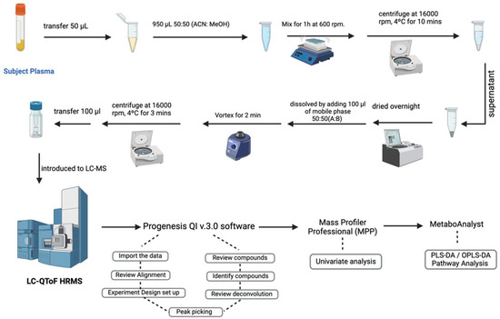Metabolites from 224 volunteer and 20 pooled quality control (QC) samples were extracted following the lab’s standard protocol and stored at −80 °C [25]. In detail, 50 µL of plasma was transferred into an Eppendorf tube. The metabolites were extracted by adding 950 µL of the extraction solvent 1:1 v/v (ACN: MeOH). Afterward, the samples were placed on the shaker for 1 hr at 25 °C in a Thermomixer at 600 rpm (Eppendorf, Germany). The slurry was centrifuged at 16,000 r.p.m and 4 °C for 10 min, and the supernatant was transferred into a new Eppendorf tube to be evaporated using a speed vacuum overnight (SpeedVac; Christ, Germany). The dried extract, stored at −80 °C, was reconstituted for metabolomics analysis with 100 µLof mobile phase (1:1) A:B [A: 0.1% formic acid in dH2O—B: 0.1% formic acid in 1:1 v/v MeOH and ACN] (Scheme 2).