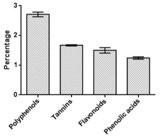Initially, the amount of main phenolic compounds in the mushroom-tested sample was measured to focus our attention on the relevant groups of biologically active substances with presumed value. The amount of water-soluble phenolic compounds and tannins was expressed as pyrogallol equivalent (in % dry-weight mass of substances). The I. nidus-pici from Bulgaria contained 2.71 ± 0.08% of total water-soluble polyphenols, with 1.67 ± 0.02% identified as tannins and almost the same amount of the established phenolic acids (1.50 ± 0.09%). Compared to other groups, flavonoids were present in the lowest quantity (1.24 ± 0.04%) (Figure 1). All the spectrophotometric methods used in this study further outlined the need for an in-depth analysis using modern instrumental methods.