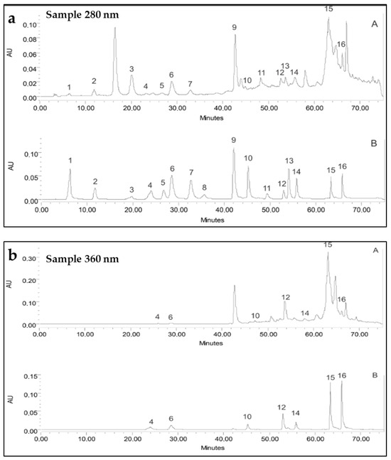 HPLC chromatograms of phenolic compounds from I. nidus-pici (A) and used standards (B) determined at 280 nm (a) and 360 nm (b). (a) Peaks (280 nm): 1—Gallic acid, 2—Protocatechuic acid, 3—(+)-Catechin, 4—Chlorogenic acid, 5—Vanillic acid, 6—Caffeic acid, 7—Syringic acid, 8—(−)-Epicatechin, 9—p-Coumaric acid, 10—Ferulic acid, 11—Salicylic acid, 12—Rutin, 13—Hesperidin, 14—Rosmarinic acid, 15—Quercetin, and 16—Kaempferol. (b) Peaks (360 nm): 4—Chlorogenic acid, 6—Caffeic acid, 10—Ferulic acid, 12—Rutin, 14—Rosmarinic acid, 15—Quercetin, and 16—Kaempherol.
