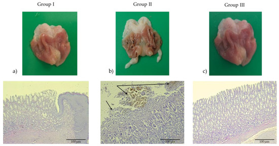 Macroscopic and photomicrographs of stomachs with H&E (200× magnification, scale bar 100 μm). (a) The control group received 1 mL of saline orally for 14 consecutive days. (b) Indomethacin-treated group (induction dose: 40 mg/kg); erosions (arrow left) and erosions with haemosiderin (arrow right). (c) Group III pretreated with famotidine (20 mg/kg) for 14 consecutive days prior to ulcer induction. The group showed no damage to the gastric mucosa, both macroscopically and with histological analysis.