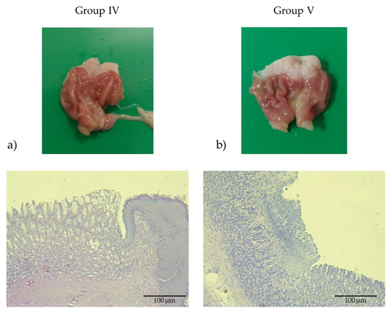 Macroscopic images and photomicrographs of stomachs with H&E (200× magnification, scale bar 100 μm). (a) Group IV pretreated with EPE from Inonotus nidus-pici (25 mg/kg) for 14 consecutive days prior to ulcer induction. (b) Group V pretreated with EPE from Inonotus nidus-pici (10 mg/kg) for 14 consecutive days prior to ulcer induction. The groups showed dose-dependent protective effects, both macroscopically and with histological analysis.