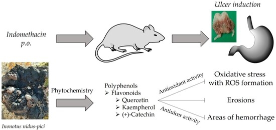 - Xin, X.; Qu, J.; Veeraraghavan, V.P.; Mohan, S.K.; Gu, K. Assessment of the Gastroprotective Effect of the Chaga Medicinal Mushroom, Inonotus obliquus (Agaricomycetes), Against the Gastric Mucosal Ulceration Induced by Ethanol in Experimental Rats. Int. J. Med. Mushrooms 2019, 21, 805–816. [Google Scholar] [CrossRef] [PubMed]