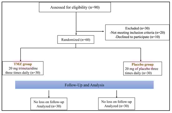 A double-blind, placebo-controlled trial was conducted at Beni-Suef University Hospital from December 2023 to November 2024. The research protocol adhered to the principles of the Declaration of Helsinki and received approval from the hospital’s Ethics Committee. The Clinical Trials Registry registration number for this trial is NCT06140953. Prior to enrollment, written informed consent was obtained from each participant. As illustrated in Figure 1, the study was a double-masked, placebo-controlled experiment lasting 24 weeks, with participants randomly assigned using a computer-generated allocation sequence. Allocation concealment was ensured using sealed opaque envelopes. Participants were randomized into two groups (1:1) to receive either trimetazidine 20 mg orally three times a day, along with lifestyle adjustments, or a placebo combined with lifestyle modifications. Both the active medication and the placebo tablet were identical in form, color, and packaging. Throughout the study, the trimetazidine group received a total of 60 mg daily.