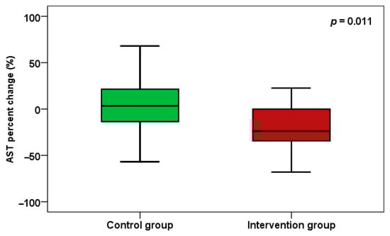 Regarding liver fibrosis and steatosis, CAP shows improvement, with a significant difference between groups (p < 0.001) and a percent change at p = 0.001 (Figure 2). Regarding aminotransferases, AST in the trimetazidine group showed a significant decrease (p < 0.001), and AST also demonstrated a significant difference between groups (p = 0.032), with a percent change of p = 0.011 (Figure 3).