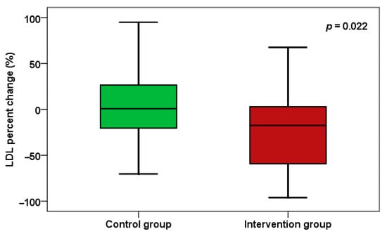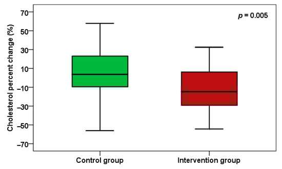 Regarding the lipid profile and metabolic parameters after 24 weeks, LDL cholesterol levels decreased significantly (p = 0.004) between the two groups, with a percent change of p = 0.022 (Figure 4). There was also a significant reduction in total cholesterol (p = 0.004 between groups), with a percent change of p = 0.005 (Figure 5). Additionally, there were no significant changes in HDL cholesterol and other metabolic measures. Additionally, there were no significant alterations in HOMA-IR and fasting blood glucose between the two groups. Notably, there were no significant side effects observed over the 24 weeks in either group.