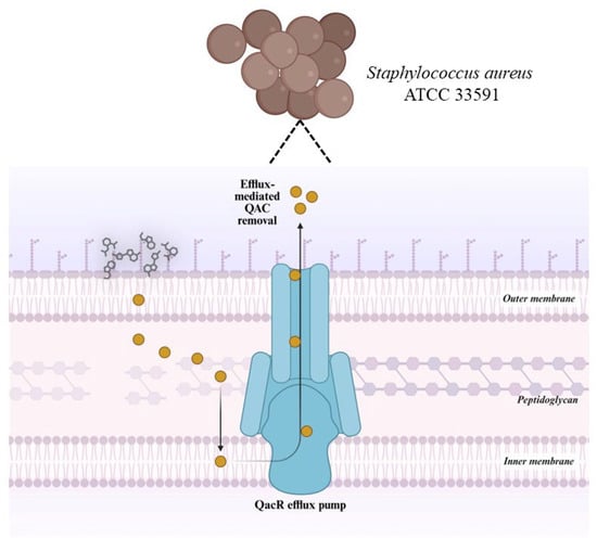 Mechanism of efflux-mediated resistance in Staphylococcus aureus ATCC 33591 via the QacR-regulated efflux pump. This figure was created using BioRender (www.biorender.com, accessed on 26 June 2025).