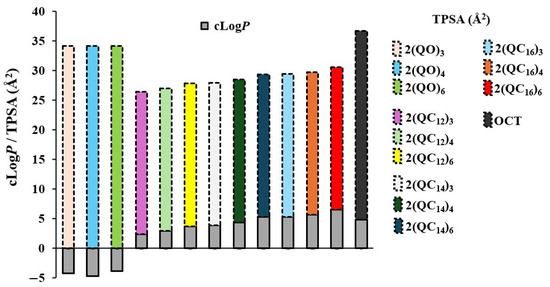 Graphical representation of lipophilicity (cLogP) and topological polar surface area (TPSA/Å2) values for a series of bisQACs derivatives of quinuclidine. TPSA is shown as the colored portion of each bar, while cLogP corresponds to the lower grey segment.