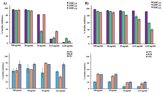 In this study, the minimal biofilm inhibition concentrations (MBICs) of synthesized bisquaternary ammonium compounds (bisQACs) were evaluated at five different concentrations (6.25, 12.5, 25, 50, and 100 µg/mL), Figure 5. The results were expressed as the percentage of inhibited bacterial biofilm formation and compared with the activity of two commercial quaternary ammonium compounds—benzyldimethyldodecylammonium bromide (BAB) and cetylpyridinium chloride (CPC)—as well as with the reference β-lactam antibiotic cefotaxime (CFX). The aim of the study was to assess the potential of bisQACs in reducing biofilm formation and enhancing antimicrobial efficacy, with a particular focus on their application in combatting persistent and multidrug-resistant bacterial infections.