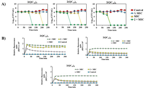 (A) Time-dependent reduction of Staphylococcus aureus ATCC 25923 viable cells, expressed as log10 CFU/mL, monitored via plate counting during a 4 h exposure to ½ MIC, MIC, and 2 × MIC concentrations of bisquaternary ammonium compounds 2(QC16)3, 2(QC14)6, and 2(QC16)6. (B) Kinetic analysis of membrane integrity disruption measured by propidium iodide (PI) uptake using spectrofluorimetry in Staphylococcus aureus ATCC 25923 treated with 4 × MIC, 2 × MIC, and MIC of the tested compounds compared to untreated controls. Fluorescence intensity was recorded at defined time points over a 6 h incubation period.