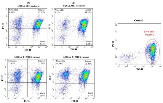 Flow cytometry dot plots of viable, injured, and dead Staphylococcus aureus ATCC 25923 cells stained with thiazole orange (TO) and propidium iodide (PI), at the beginning of the experiment (A) and after 4 h (B) of treatment with 2(QC16)6 at MIC and 2 × MIC concentrations.