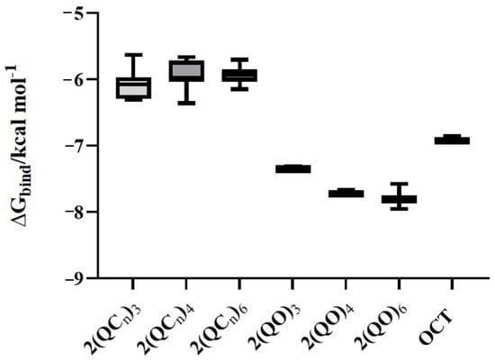 Box-and-whisker plot of calculated ΔGbind values for bisQAC analogs (n = 12 C, 14 C, and 16 C) interacting with QacR protein.