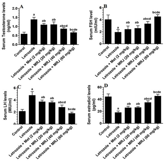 The levels of major sex hormones ((A) Testosterone; (B) FSH; (C) LH and (D) Estradiol) in the serum of all groups of rats. Data are presented as means ± SD for n = 7 rats/group. Values were considered significantly different at p < 0.05. (a): Significantly differed from the control group; (b): significantly differed from letrozole-treated rats; (c): significantly differed from letrozole + metformin (Met)-treated rats; (d): significantly differed from letrozole + MRJ-treated animals (20 mg/kg); and (e): significantly differed from letrozole + MRJ-treated animals (40 mg/kg). Note: MRJ: Origanum majorana; Met: metformin, FSH: follicle-stimulating hormone; LH: luteinizing hormone.