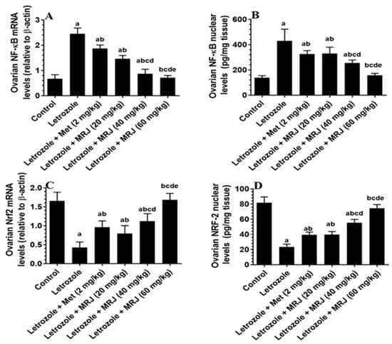 mRNA and nuclear levels of NF-κB ((A) NF-κB mRNA; (B) NF-κB nuclear levels) and Nrf2 ((C) Nrf2 mRNA; (D) Nrf2 nuclear levels) in the ovaries of all groups of rats. Data are presented as means ± SD for n = 7 rats/group. Values were considered significantly different at p < 0.05. (a): Significantly differed from the control group; (b): significantly differed from letrozole-treated rats; (c): significantly differed from letrozole + metformin (Met)-treated rats; (d): significantly differed from letrozole + MRJ-treated animals (20 mg/kg); and (e): significantly differed from letrozole + MRJ-treated animals (40 mg/kg). Note: MRJ: Origanum majorana; Met: metformin; Nrf2: Nuclear Factor Erythroid 2-Related Factor 2; NF-κB: Nuclear Factor-kappa B.