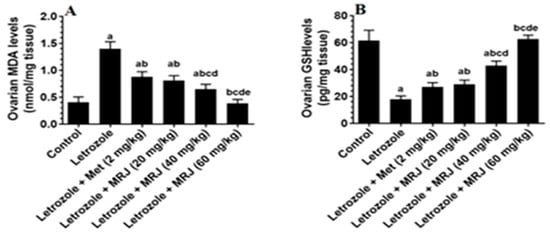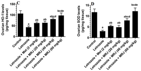The levels of some antioxidant mediators ((A) MDA; (B) GSH; (C) HO-1; and (D) SOD) in the ovaries of all experimental groups. Data are presented as means ± SD for n = 7 rats/group. Values were considered significantly different at p < 0.05. (a): Significantly differed from the control group; (b): significantly differed in letrozole-treated rats; (c): significantly differed from letrozole + metformin (Met)-treated rats; (d): significantly differed from letrozole + MRJ-treated animals (20 mg/kg); and (e): significantly differed from letrozole + MRJ-treated animals (40 mg/kg). Note: MRJ: Origanum majorana; Met: metformin; MDA: malondialdehyde; GSH: total glutathione; HO-1: heme-oxygenase-1; SOD: superoxide dismutase.