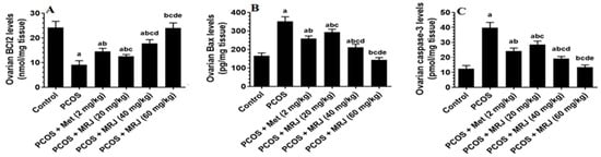 There was a significant rise in Bax and caspase-3 levels with a significant concomitant decrease in the ovarian Bcl-2 levels in letrozole-treated animals as compared to control rats, which were reversed with all treatments (Figure 6). Comparing letrozole + Met, letrozole + MRJ (20 mg/kg), and letrozole + MRJ (40 mg/kg) rats with control rats, the levels of Bcl-2 were significantly lower and the levels of Bax and caspase-3 were significantly higher (Figure 6). In addition, there was a significant progressive variation in the levels of these markers with increasing doses of MRJ. Of note, the levels of Bcl-2, Bax, and caspase-3 were not significantly different in the ovaries of letrozole + MRJ (60 mg/kg)-treated rats when compared to these levels measured in the ovaries of control rats (Figure 6).