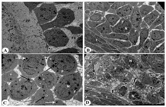 Transmission electron micrographs (TEMs) are taken for all control (A,B) and letrozole-treated rats (C,D). Photomicrograph A: showing an early intact antral follicle that has spaces between adjacent granulosa cells (GCs) filled with follicular fluid (FF). The granulosa cells surrounding the oocyte (O) through zona pellucid (ZP) are seen, ×5000. Photomicrograph B: showing a secondary follicle with several layers of follicular cells (F) surrounded by the theca layer (t). In addition, each of these follicular cells contained an intact nucleus (N), ×5000. Photomicrograph C: showing the secondary follicular cells containing an increased number of phagocytic vacuoles (black arrows) and electron-dense granules (white arrows), ×5000. Photomicrograph D: showing extreme cytoplasmic degeneration in the secondary follicular cells that appeared to contain plenty of lipid vacuoles (V) and pyknotic nuclei (N) as well as a dilated nuclear membrane (arrow), ×5000.