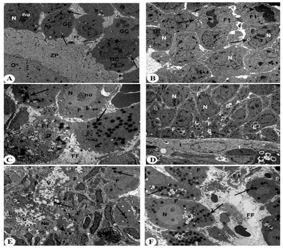 Transmission electron micrographs (TEMs) are taken for all letrozole + Met-treated rats (A–C) and letrozole + MRJ (20 mg/kg)-treated rats (D–F). Photomicrograph A: showing an increased number of phagocytic vacuoles (Arrow) in the antral follicle. However, almost intact granulosa cells (GCs), follicular fluid (FF), and granulosa cells surrounding the oocyte (O) through zona pellucid (ZP) are seen, ×5000. Photomicrograph B: showing two follicular cells (F1) in the state of mitotic division (head arrows) and an increased number of small phagocytic vacuoles (Arrow), × 5000. Photomicrograph C: showing a damaged and degenerated secondary follicular cell (F1) containing phagocytic vacuoles (V), euchromatic nuclei (N), segregation of nucleolus (nu), and a large number of electron-dense granules (arrows), ×5000. Photomicrograph D: showing severe cytoplasmic degeneration in follicular cells (F), which still bearing plenty of vacuoles (V) and pyknotic nuclei (N), a dilated nuclear membrane (Arrow), and lipid droplets (L), surrounded by the theca layer (t), ×5000. Photomicrograph E: showing severe degeneration in the secondary follicular cells (F) with the existence of a high number of phagocytic (V) and lipid vacuoles (L), as well as shrunk nucleus (N) and few electron-dense granules (arrows), ×5000. Photomicrograph F: showing a damaged and degenerated secondary follicular cell (F1), euchromatic nuclei (N) with segregation of nucleolus (nu), an increased number of lipid and phagocytic vacuoles (V), and a large number of electron-dense granules (arrows), and an increased number of lipid and phagocytic vacuoles (V), ×5000.