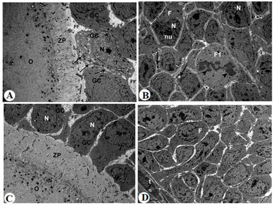 Transmission electron micrographs (TEMs) are taken for letrozole + MRJ (40 mg/kg)-treated rats (A,B) and letrozole + MRJ (60 mg/kg)-treated rats (C,D). Photomicrograph A: showing an early intact antral follicle that has spaces between adjacent granulosa cells (GCs) filled with follicular fluid (FF). The granulosa cells surrounding the oocyte (O) through zona pellucid (ZP) are intact. However, even the majority of follicles are almost normal, some of them show a high number of dilated vacuoles (Arrows), ×5000. Photomicrograph B: showing an extremely dilated and damaged secondary follicular cell (F1) in its mitotic division state (Head arrows), and few small phagocytic vacuoles (Arrow). Other follicles (F) show degeneration in the nuclei (N) with segregation of nucleolus (nu), ×5000. Photomicrograph C: showing a normal antral follicle with normal GC, ZP, and FF, ×5000. Photomicrograph D: showing normal secondary follicles with just very few numbers of phagocytic vacuoles (arrows), ×5000.