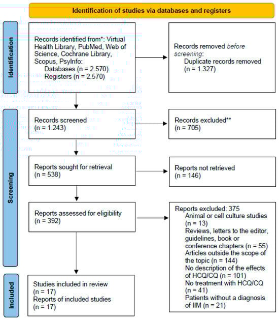 A qualitative systematic review of the literature was conducted according to the PRISMA protocol using six electronic databases: Virtual Health Library, PubMed, Cochrane library, Web of Science, Scopus, and PsycInfo. The electronic searches utilized the Medical Subject Headings (MeSH) descriptors: #1 “Hydroxychloroquine”; #2 “Chloroquine”; #3 “Idiopathic inflammatory myopathies”; #4 “Polymyositis”; #5 “Dermatomyositis”; #6 “Anti-synthetase syndrome”; #7 “Immune-mediated necrotizing myopathy”; #8 “Myositis, inclusion body”. These descriptors were combined using the Boolean Operator “AND”.