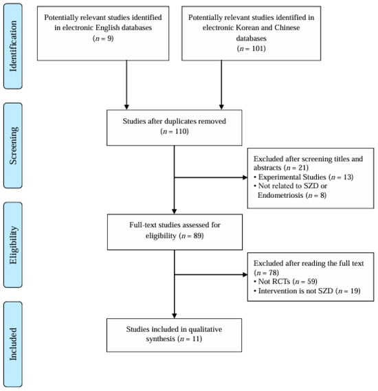 A total of 110 records were initially identified. After screening titles and abstracts, 8 studies unrelated to SZD or endometriosis and 13 experimental (non-clinical) studies were excluded. Full texts of the remaining 89 articles were assessed, resulting in the exclusion of 59 non-randomized studies and 19 studies not involving SZD as an intervention. Ultimately, 11 RCTs [21,22,23,24,25,26,27,28,29,30,31] were included in this review. The study selection process is illustrated in Figure 1. All included studies were conducted in China and published in Chinese. The detailed characteristics of the included studies are summarized in Table 1.