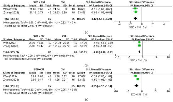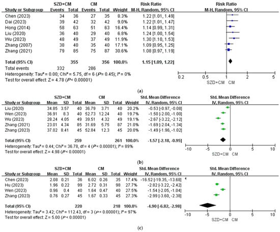 A total of 10 studies compared SZD combined with CM versus CM alone. For the primary outcome, seven clinical trials [21,22,23,24,25,26,29] assessed TER. Meta-analysis showed that the SZD plus CM group demonstrated a statistically significant improvement compared to the CM group (OR = 1.15; 95% CI: 1.09–1.22; p < 0.00001) (Figure 2a). In five studies [23,24,28,29,30], meta-analysis revealed a significant reduction in serum CA-125 levels in the experimental group compared to the control group (OR = −1.57; 95% CI: −2.18 to −0.95; p < 0.00001) (Figure 2b). Additionally, four studies [25,27,28,30] reported that the combination of SZD and CM was significantly more effective than CM alone in alleviating pain (OR = −4.90; 95% CI: −6.82 to −2.98; p < 0.00001) (Figure 2c).