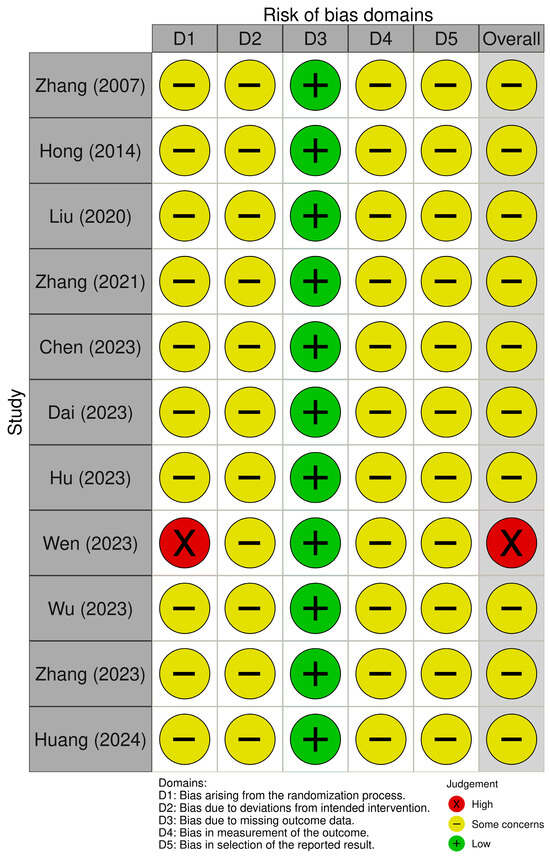 The overall ROB for the included studies [21,22,23,24,25,26,27,28,29,30,31] was assessed as follows: ten studies (90.9%) were rated as having “some concerns”, and one study (9.1%) was judged to have a high risk of bias (Figure 4). Ten studies [21,22,23,24,25,26,27,29,30,31] were rated as having “some concerns” due to insufficient information for assessing the domains of the randomization process, deviations from intended interventions, measurement of the outcome, and selection of the reported result. In the domain of missing outcome data, all ten studies were considered to have a low risk of bias, as they either reported no dropout or reported dropout rates of approximately 5%. The one remaining study used an odd–even allocation method, which cannot be regarded as an appropriate randomization method, and did not provide information regarding allocation concealment. Therefore, this study was rated as having a high risk of bias in the randomization process and an overall risk of bias.
