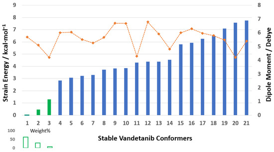 The strain energy (kcal·mol−1) of the partially optimized VTB conformers with a cut off at 7.758 kcal·mol−1 (blue columns) and their corresponding dipole moments (in Debye, orange), based on B3LYP/6-311++G(d,p) level of theory. The detailed results are in Table S1 of the SM.
