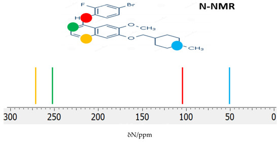 The 14N NMR chemical shifts (δN) provide valuable insights into the chemical environment and electronic structure of nitrogen atoms in pharmaceutical inhibitors. In VTB, the four nitrogen atoms occupy distinct chemical environments, leading to well-differentiated δN values in the calculated 14N NMR spectrum (Figure 7). For the global minimum structure, the predicted δN values are 274.15 ppm, 250.89 ppm, 110.27 ppm, and 53.04 ppm, corresponding to the nitrogen atoms in the quinazoline ring, the bridging secondary amine (-NH-), and the piperidine nitrogen, respectively. In these calculations, ammonia (NH3), with a shielding constant σN = 258.4 ppm, was used as the reference compound for determining the chemical shifts. These distinct δN values reflect the varying degrees of electron density and local chemical environments surrounding each nitrogen atom, consistent with their roles in the molecule’s aromatic and aliphatic regions.