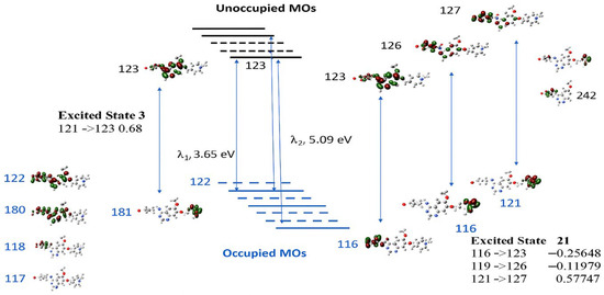 The excited states of the transitions and the related molecular orbitals (MOs). The number associated with the MO electron density distributions is the orbitals. Here, MO122 is the HOMO, and MO123 is the LUMO. The MOs involved in the transitions are presented by solid lines, and other MOs not involved in the above transitions are presented as dashed lines.