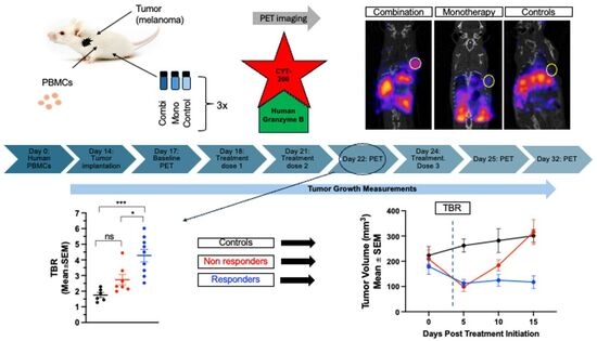 This study aimed to thoroughly evaluate the usefulness of a new human GZB PET imaging tracer, 68Ga-NOTA-CYT-200, in assessing the responses to ICI therapy by comparing the in vivo tumor and organ radiotracer uptake with ex vivo data such as a biodistribution and immunohistochemical analysis. 68Ga-NOTA-CYT-200 is a novel PET probe designed to target the active form of human GZB; it consists of a GZB-targeting peptide linked to a NOTA chelator, allowing efficient radiolabeling with gallium-68 for PET imaging. NOTA-CYT-200 has a nanomolar inhibition constant (Ki 4.2 nM) for GZB, indicating strong, selective binding to active GZB with minimal off-target effects. Its design facilitates quick clearance from non-target tissues, boosting the tumor-to-background ratios and imaging accuracy. Compared to earlier GZB-targeting agents, NOTA-CYT-200 was selected for its improved specificity, better pharmacokinetics, and suitability for humanized models, making it an effective tool for detecting functional cytotoxic T-cell activity during the effector phase. The early detection of active immune responses—potentially before observable tumor changes—is a key advantage of this tracer, which is the focus of this study.