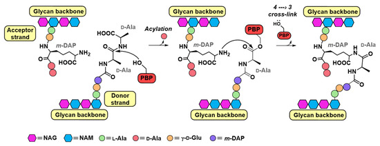 Mechanism of PBP transpeptidases. The PBP nucleophilic serine attacks a pentapeptide on the donor strand, forming a peptide–enzyme complex and releasing d-alanine. From the acceptor strand of peptidoglycan, a nucleophilic side chain (here, m-DAP) reacts with the peptide–enzyme complex, forming a 4 → 3 peptidoglycan cross-link, followed by release of the enzyme.
