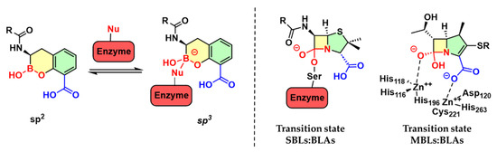Boronic acid transition state inhibitors, such as SBL and MBL inhibitors. The boron atom changes the hybridization from sp2 to sp3 and mimics the high-energy anionic tetrahedral transition state formed during the catalysis of both enzyme families.
