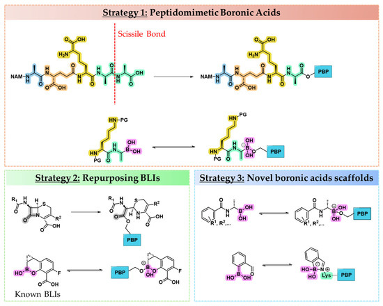 A second, more pragmatic strategy draws inspiration from BLIs, many of which integrate the boronic acid pharmacophore within side chains derived from BLAs (Figure 3, Strategy 2). Repurposing boron-based BLIs to PBPs leverages the structural similarity between SBLs and PBPs but may fail to account for the unique substrate recognition features and mechanistic nuances of PBPs [39].