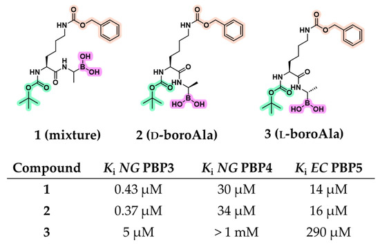 Early peptidomimetic boronic acid inhibitors were initially used as probes to study the enzymology of PBPs, exploiting substrate mimicry to investigate catalytic mechanisms, substrate specificity, and SAR analysis. In a landmark study, Pechenov et al. synthesized several transition-state analogs by modifying natural peptidyl substrates with electrophilic groups (e.g., aldehydes, trifluoromethyl ketones, chloromethyl ketones, and boronic acids) capable of covalent interaction with active-site serine [36]. The dipeptide Boc-l-Lys(Cbz)-d-Ala was selected as a scaffold, mimicking a portion of the PBP substrate up to the cleavage site. A panel of LMM PBPs with measurable enzymatic activity against d-Ala-d-Ala-based substrates, including Escherichia coli (EC) PBP5 (class A) and Neisseria gonorrhoeae (NG) PBPs 3 and 4 (class C), was used for biological evaluation. Although LMM PBPs are not essential for bacterial viability and are not primary targets of β-lactams, their active site architecture is highly conserved, making them suitable models for probing PBP enzymology. Among seven tested inhibitors, peptide boronic acids were the most effective, demonstrating inhibitory activity against all three tested PBPs, an outcome not observed with the other compound classes (Figure 4). Initially, compound 1, synthesized as a pinacol-protected diastereomeric mixture of peptide boronic acids derived from d- and l-boroalanine, was evaluated. It exhibited a potent inhibition of NG PBP3 (Ki = 0.43 μM), along with moderate affinity for NG PBP4 (Ki = 30 μM) and EC PBP5 (Ki = 14 μM). To discern the active diastereoisomer, compounds 2 (d-boroAla) and 3 (l-boroAla) were obtained using (−)- and (+)-pinanediol as a chiral auxiliary. Compound 2 retained strong inhibitory activity, slightly improving the Ki for NG PBP3 observed with compound 1, while maintaining comparable activity against NG PBP4 and EC PBP5. Kinetic analyses confirmed that compound 2 acts as a competitive inhibitor, engaging the catalytic serine within the active site [36].