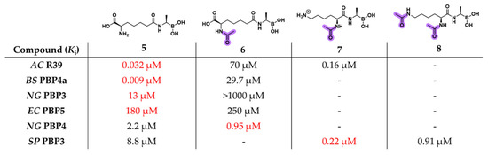 Structures of the peptidomimetic boronic acids 5–8 and their relative activity (Ki) for a panel of LMM PBPs. In violet is highlighted the acetyl protecting group. Within the table, the red writing indicates the best inhibitor for each PBP.