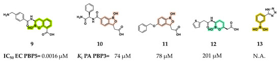 Structures of compounds 9–13 and their relative activities for EC PBP5 (compound 9) and PA PBP3 (compounds 10–13). Benzoxaborinine rings are highlighted in green, benzoxaboroles in pink, monocyclic boronates in cyan, and phenylboronic acids in yellow.