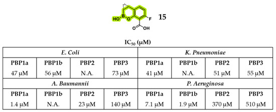 Another benzoxaborinine, the phase I candidate xeruborbactam [49] (compound 15, formerly QPX7728), exhibited notable intrinsic antibacterial activity in addition to its established role as a BLI. An exhaustive report by Sun et al. demonstrated direct inhibition of both Gram-negative and Gram-positive bacteria, with effective concentrations exceeding those required for β-lactamase inhibition [49]. Importantly, compound 15 enhanced the efficacy of various BLAs even in bacterial strains lacking BL enzymes, underscoring a mechanism of action independent of enzyme inhibition. Its antibacterial effect has been associated with binding to PBPs, and the resulting morphological alterations in Klebsiella pneumoniae (KP) and P. aeruginosa (PA) closely resembled those induced by meropenem, suggesting functional disruption of multiple PBPs. Thus, the mode of action of compound 15 has been reported to be consistent with direct interference in cell wall biogenesis. This has also been confirmed by its relative binding activity to HMM PBPs of four different Gram-negative bacteria (Figure 10), including some encouraging IC50 values displayed against Acinetobacter baumanii (AC) PBP1a (IC50 = 1.4 μM) and PA PBP1b (IC50 = 1.9 μM) [49].