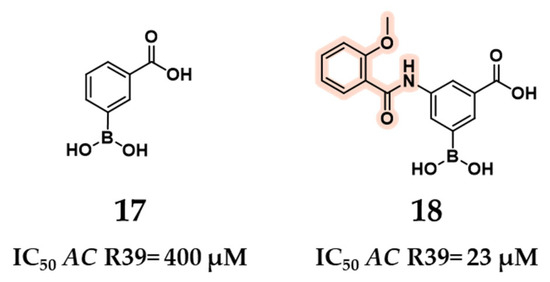 In 2009, Inglis et al. identified the 3-(dihydroxyboryl)benzoic acid scaffold (compound 17) as a promising starting point for the development of inhibitors targeting the d,d-carboxypeptidase AC R39 [52]. To support the design of inhibitors for SP HMM PBPs, such as PBP1b, PBP2x^R6, and the penicillin-resistant PBP2x^5204, AC R39 was employed as a mechanistic and structural model to screen a set of commercially available boronic acids for initial activity. The parent compound 17 exhibited an IC50 of 400 µM against AC R39. Guided by docking studies, the design was optimized through substitution at the 5-position of the phenylboronic acid ring, introducing a derivatized benzamido group to yield 3-(dihydroxyboryl)-5-(2-methoxybenzamido) benzoic acid (compound 18). This modification significantly improved potency, with compound 18 showing an IC50 of 23 µM against R39 (Figure 12). The rationale for introducing a derivatized benzamido group was based on the expectation that the boronic acid moiety would form a covalent bond with the catalytic serine, while the carboxyl group would engage the same residues observed in the nitrocefin-bound crystal structure. To exploit these predictable anchoring interactions, the benzamido substituent was designed to mimic the C7 side chain of nitrocefin, thereby enhancing interactions with the adjacent subpocket [52].