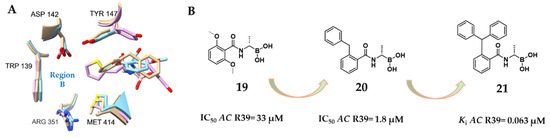 Inglis’s work highlighted the potential of targeting a hydrophobic region within the AC R39 active site, flanked by Tyr147 and Trp139. Building on this, Woon et al. investigated the subpocket occupied by the nitrocefin side chain, referring to it as “region B” (Figure 13A). Using the crystal structure of the acyl–enzyme complex between AC R39 and nitrocefin as a structural reference, they adopted a multidisciplinary strategy to explore the inhibition of the d,d-carboxypeptidase R39 by various transition state analogs, including trifluoromethyl ketones, phosphonates, and boronic acids [40]. From this campaign, two initial boronic acid-based hits were identified, including compound 19, which exhibited an IC50 value of 33 μM for AC R39. Structural analysis revealed that the phenyl ring of compound 19 engages in π-stacking interactions with Tyr147, offering a starting point for optimization. Computational modeling and crystallographic refinement guided the design of compound 20, featuring a benzyl group introduced in the o-position. This substitution exploited the pocket tolerance for lipophilic substituents, resulting in a nearly 20-fold improvement in potency (IC50 = 1.8 μM for R39; SPROUT score = −7.04). Interestingly, the benzyl moiety of compound 20 extended into a different pocket, defined by residues Ser49, Glu178, Phe297, and Ser298, while the benzamido group continued to maintain π-stacking with Tyr147. The structural insights obtained from the R39:20 complex enabled the design of compound 21, which incorporated a triphenylmethyl substituent appended to the aminoacyl side chain of the boronic acid core. This final derivative achieved the highest potency in the series, with an IC50 value of 63 nM (SPROUT score = −7.96) against the LMM R39 (Figure 13B). Collectively, these studies revealed the importance of targeting specific key sub-pockets, including the AC R39 region B, for achieving high-affinity binding in boronic acid inhibitors [40].
