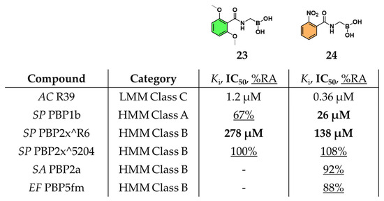 Subsequently, Zervosen et al. explored the inhibitory potential of various amidomethylboronic acids by soaking them into pre-formed crystals of the model AC R39. Upon solving the crystal structures and measuring their binding affinities, they unexpectedly observed the formation of tri-covalent boronate adducts within the R39 active site. Given the structural resemblance between the TP domain of PBPs and class A BLs, the side chain of compound 23, structurally resembling that of methicillin, was identified as a key determinant of activity. In the same article, another compound, 2-nitrobenzamidomethylboronic acid (24), was also reported to display a potent Ki of 0.36 μM [39]. To further explore the role of β-lactam side chains in PBP inhibition, a series of acylaminomethylboronic acids bearing side chains derived from various penam antibiotics were synthesized [47]. Among these, the previously reported compound 24, emerged as a broad-spectrum inhibitor, displaying potent activity across class A (PBP1b, IC50 = 26 µM), class B (PBP2x^R6, IC50 = 138 µM), and class C (R39, data shown above) PBPs from penicillin-sensitive strains (Figure 15). These results underscored the significant influence of the side chain structure on inhibitory potency, paralleling observations made in kinetic studies of penams with variable side chains. Despite their promising enzymatic activity, compounds 23 and 24 lacked antibacterial efficacy when evaluated against a panel of bacterial strains, suggesting a possible disconnect between in vitro PBP inhibition and cellular activity.