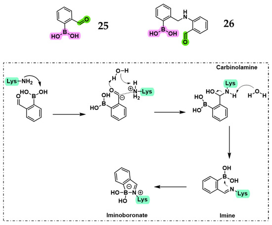 Compounds 25 and 26, with potential dual anchoring, and predicted mechanism of action (dotted box). The boronic acid moiety is highlighted in fuchsia, the carbonyl in green, and the lysine in light green.