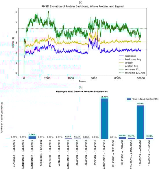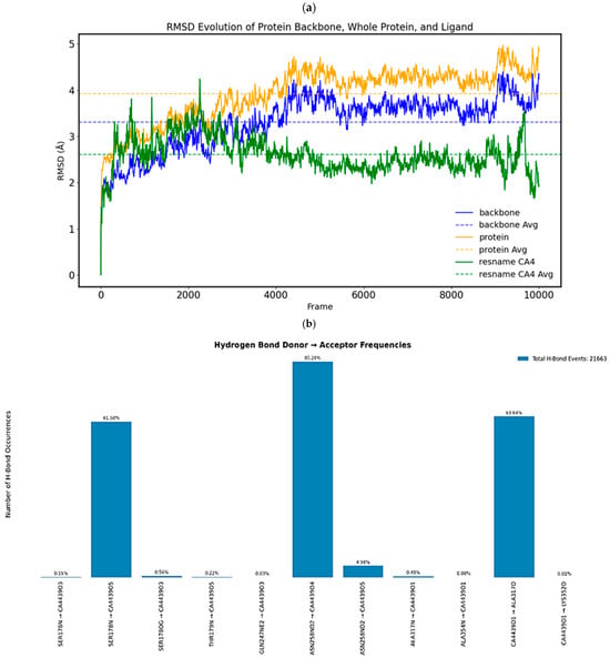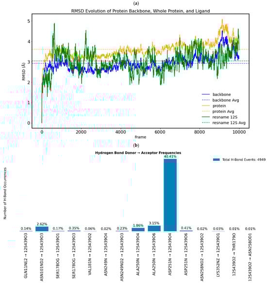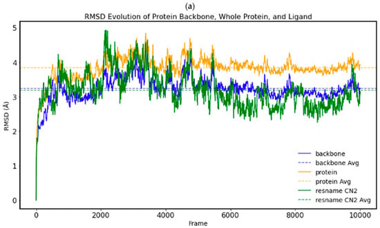 From the MD simulations, we calculated the following: hydrogen bonds between the compounds and the protein, RMSD fluctuations of the complexes from their initial position, the RMSDs obtained by structurally overlaying the most representative frame from MD simulations over the predicted docked poses, and lastly, the structural overlays of the most representative frame from MD simulations of the two compounds to the representative frame of 1Z2B obtained from the MD simulation. The distance between the compounds and the co-crystallised ligand CN2 was calculated by considering the centre of mass. The MD run of the X-ray structure with co-crystallised CN2 (DAMA-colchicine) maintained a stable RMSD, indicating system stability. The CN2 molecule formed hydrogen bonds with Ser178, Val181, and Lys352 (Figure 8a,b).