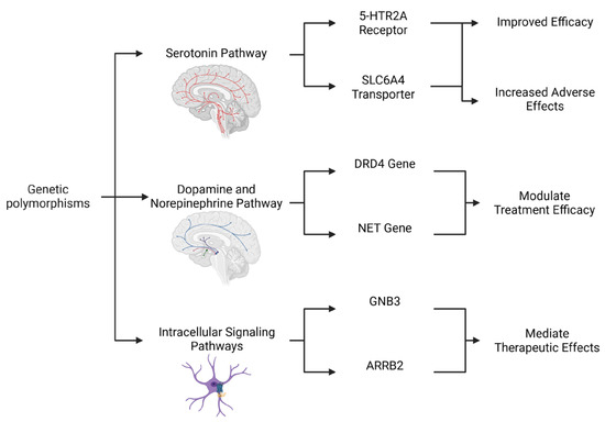 Integrated Genetic Influences on the Monoaminergic System and Antidepressant Response. This diagram illustrates a multifaceted genetic framework for predicting antidepressant outcomes and tolerability. The figure goes beyond single-gene analyses by highlighting the interconnected roles of polymorphisms in three key pathways. The serotonin pathway exhibits variants in the 5-HTR2A receptor and the SLC6A4 transporter, with different alleles being able to lead to either improved efficacy or an increased risk of adverse effects. The dopamine and norepinephrine pathway includes genetic variations in the DRD4 and NET genes, which modulate treatment efficacy. Lastly, the Intracellular Signaling Pathways highlight downstream modulators such as GNB3 and ARRB2, which mediate therapeutic effects. Together, these genetic factors contribute to the complex and variable nature of antidepressant response in MDD. Created in Biorender. Bertollo, A.G. et al. (2025).