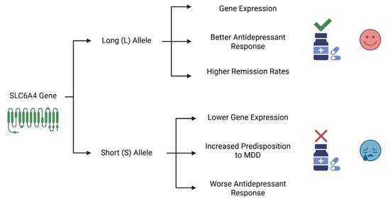 SLC6A4 encodes a serotonin transporter (SERT) and regulates serotonergic neurotransmission. A polymorphic variation in the 5-HTT gene-linked polymorphic region (5-HTTLPR) has been identified as being involved in symptoms and poor responses to antidepressants [23]. The long (L) allele, which contains a 44-base-pair insertion and is characterized by a 16-repeat sequence, is associated with higher transcriptional activity of the gene. This leads to a greater expression of the serotonin transporter (SERT) protein compared to that achieved with the short (S) allele. Variants of 5-HTTLPR are associated with the onset of depression, with the nine-repeat allele being related to cases of major depression with melancholia and cognitive dysfunction [24,25,26,27]. The differential effects of these variants on both genetic predisposition and treatment outcomes are summarized in Figure 2.