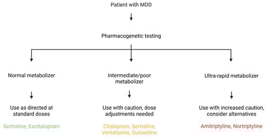 CYP450 is a family of liver enzymes responsible for metabolizing various substances, including many antidepressants. Genetic variations in the genes that encode these enzymes [62] significantly impact the serum concentrations of antidepressants and, consequently, can modulate the actions of these drugs, either increasing or decreasing their effect [63] (Table 4). The study of the CYP450 genotype contributes to a more appropriate and individualized drug choice, minimizing the rates of treatment resistance and adverse effects [64]. Furthermore, pharmacogenetics contributes to influential drug associations in MDD cases resistant to monotherapy treatment [65]. The potential clinical utility of this information is significant, as it can inform personalized treatment decisions and improve patient outcomes. A proposed workflow for incorporating pharmacogenetic testing into clinical practice is illustrated in Figure 3.