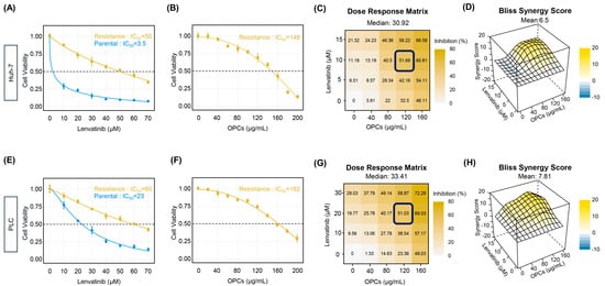 Establishment of Lenvatinib-Resistant HCC Cell Lines and Synergistic Effects of OPCs and Lenvatinib. (A,E) Dose–response curves of Lenvatinib in parental (pHuh-7 and pPLC) and resistant (rHuh-7 and rPLC) HCC cell lines. The IC50 of Lenvatinib increased markedly in resistant cells: rHuh-7 showed a >10-fold increase compared to pHuh-7 (50.3 μM vs. 3.5 μM), and rPLC showed a 2-fold increase compared to pPLC (59.7 μM vs. 23.1 μM). (B,F) Dose–response curves of OPCs in Lenvatinib-resistant HCC cell lines (rHuh-7 and rPLC). OPCs reduced cell viability in a dose-dependent manner, with IC50 values of 147.9 μg/mL for rHuh-7 and 162.0 μg/mL for rPLC. (C,G) Dose–response matrices showing the percentage reduction in cell viability of rHuh-7 and rPLC cells treated with different combinations of Lenvatinib and OPCs. In rHuh-7 cells, the combination of 10 μM Lenvatinib with 120 μg/mL OPCs reduced cell viability by 51.7%. In rPLC cells, the combination of 20 μM Lenvatinib with 120 μg/mL OPCs reduced viability by 51.0%. (D,H) Bliss synergy scores for the combinations of Lenvatinib and OPCs in rHuh-7 and rPLC cells. The most synergistic combinations achieved scores of 12.5 in rHuh-7 and 11.6 in rPLC, indicating robust synergistic effects in both cell lines.
