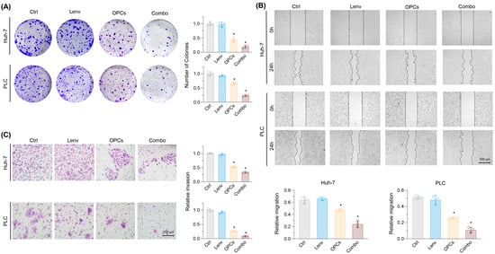 Evaluation of the Effects of Lenvatinib and OPCs on Colony Formation, Migration, and Invasion in rHuh-7 and rPLC Cells. (A) Colony formation in Lenvatinib-resistant cell lines (rHuh-7, rPLC) treated with Lenvatinib (Lenv), OPCs, or the combination. Lenvatinib alone had little effect, while OPCs significantly reduced colony formation. The combination treatment further decreased colony formation in both cell lines. (B) Wound healing assay showing the impact on cell migration. Lenvatinib alone had no effect, but the combination with OPCs significantly reduced migration in both rHuh-7 and rPLC. (C) Invasion assay results. Lenvatinib alone did not affect invasion, but combination treatment with OPCs significantly inhibited invasion in both cell lines. Data represent mean ± SD (* p < 0.05 vs. control).