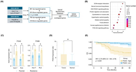 Gene Profiling Analysis Reveals Genes Involved in Lenvatinib Resistance. (A) Workflow showing the identification of differentially expressed genes from the GSE186191 dataset comparing parental and Lenvatinib-resistant Huh-7 and Hep3B cells. A total of 225 commonly altered genes were identified and analyzed using the DAVID Bioinformatics Database. (B) Pathway enrichment analysis of the 225 shared genes identified the top 10 KEGG pathways, with the ECM-receptor interaction pathway being the most enriched, including ITGA3 and ITGB8, which were also commonly found in the Focal Adhesion and PI3K/AKT signaling pathways. (C) qRT-PCR analysis of ITGA3 and ITGB8 expression in parental and rHuh-7 and rPLC cells. Both resistant cell lines exhibited significantly higher expression of these genes than their parental cell lines. (D) ITGA3 expression in 83 paired clinical samples (tumor tissue vs. adjacent non-tumor tissue). (E) Kaplan–Meier survival curve showing worse prognosis for patients with high ITGA3 expression (p < 0.001; HR = 2.73, 95% CI: 1.56–4.78). Data represent mean ± SD (* p < 0.05 vs. control).
